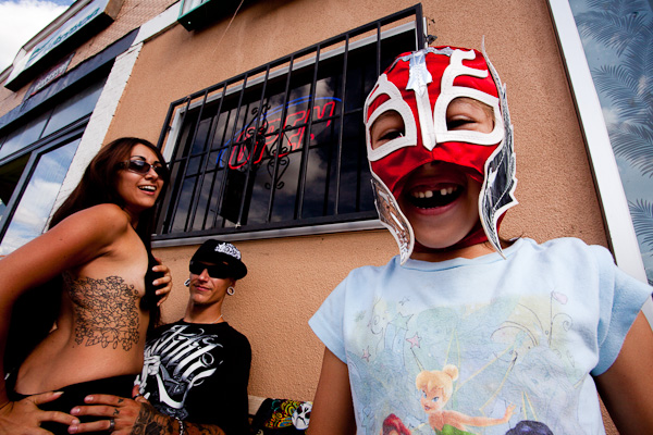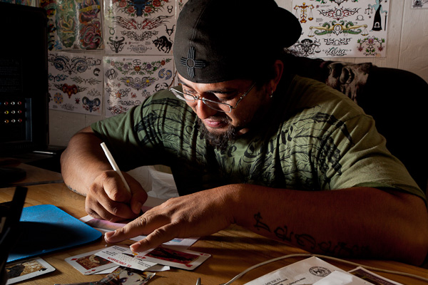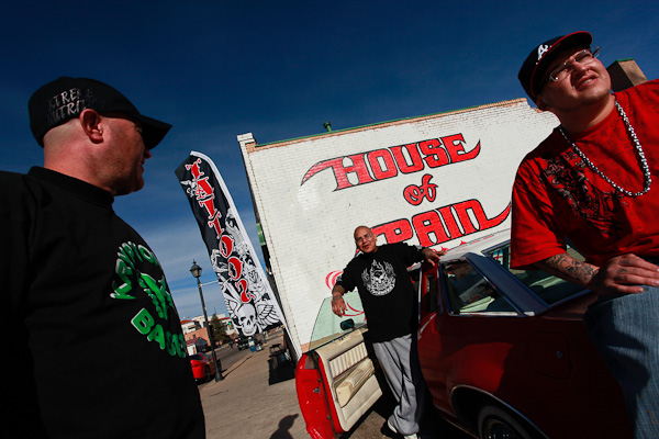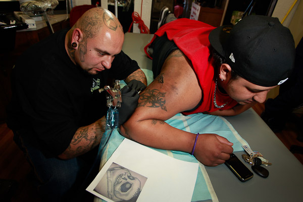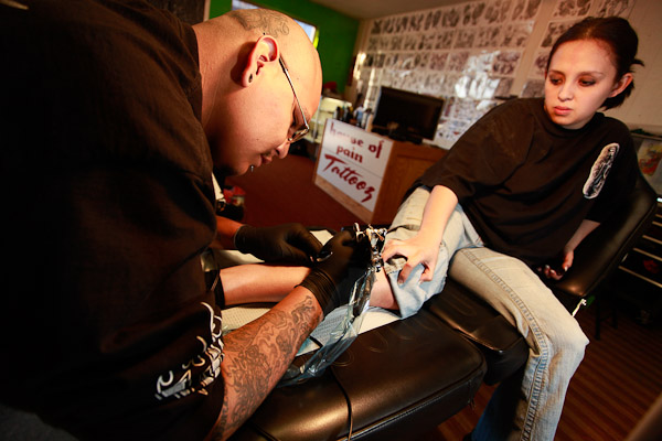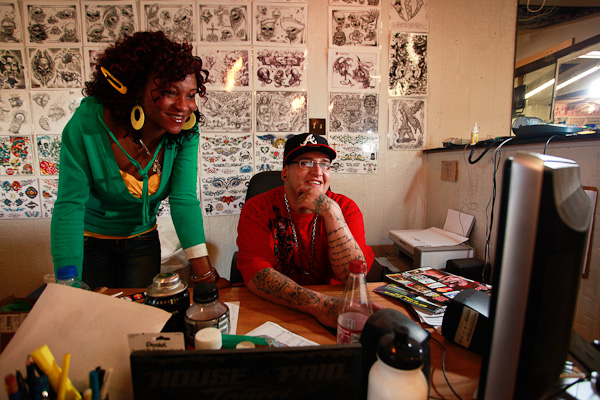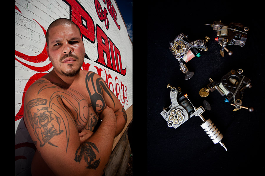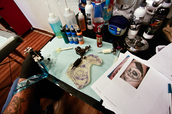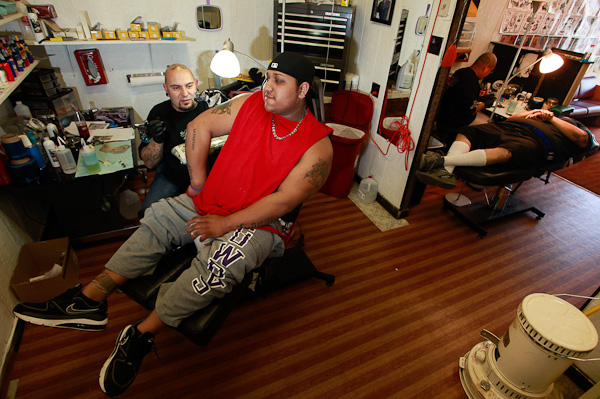 ‘So you want to learn to make documentaire work?…’ zei mijn leraar een paar jaar geleden. ‘You go there’. En hij wees naar the House of Pain waar een groepje stevige kerels op motoren voor de deur stond. Oei, dacht ik. Maar ik was geïntrigeerd en met zenuwen gierend door mijn lijf maar vastberaden daar te werken liep ik de lange weg af richting the House. De motoren waren verdwenen en ik stapte naar binnen in een fascinerende wereld die voor mij voorheen nog totaal onbekend was. ‘I wonder if I could make pictures here?’ Bracht ik er zo zelfverzekerd mogelijk uit. Geen goed idee vond L die achter zijn bureau zat te ontwerpen. Dan kon iedereen zien wat hij maakte en de ideeën misschien wel jatten en de tattoo ergens anders laten zetten. Dat gebeurde wel vaker. Maar het mocht wel buiten en na een tijdje praten en met iedereen te hebben kennisgemaakt was het helemaal geen probleem meer en kon ik ook binnen gewoon aan de slag. Het was geweldig, stuk voor stuk aardige mensen die het prima vonden dat ik mijn lens op ze richtte. Een hele middag heb ik er gewerkt en hier volgt het resultaat.